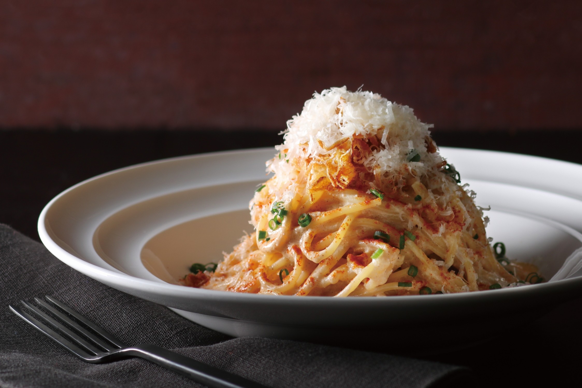 博多名物“辛子明太子”×カルボナーラの新しい組み合わせ。辛子明太子の辛みと旨みが濃厚なカルボナーラに絶妙に