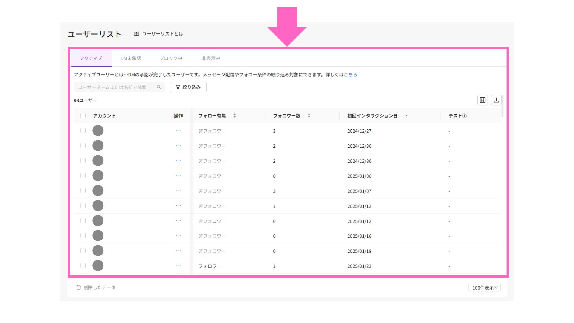 フォロワー数やタグ、最終インタラクション日など、特定の条件でユーザーを絞り込み検索し、抽出したユーザーに対してテンプレート送信やタグ付けなどの一括アクションが設定できます。