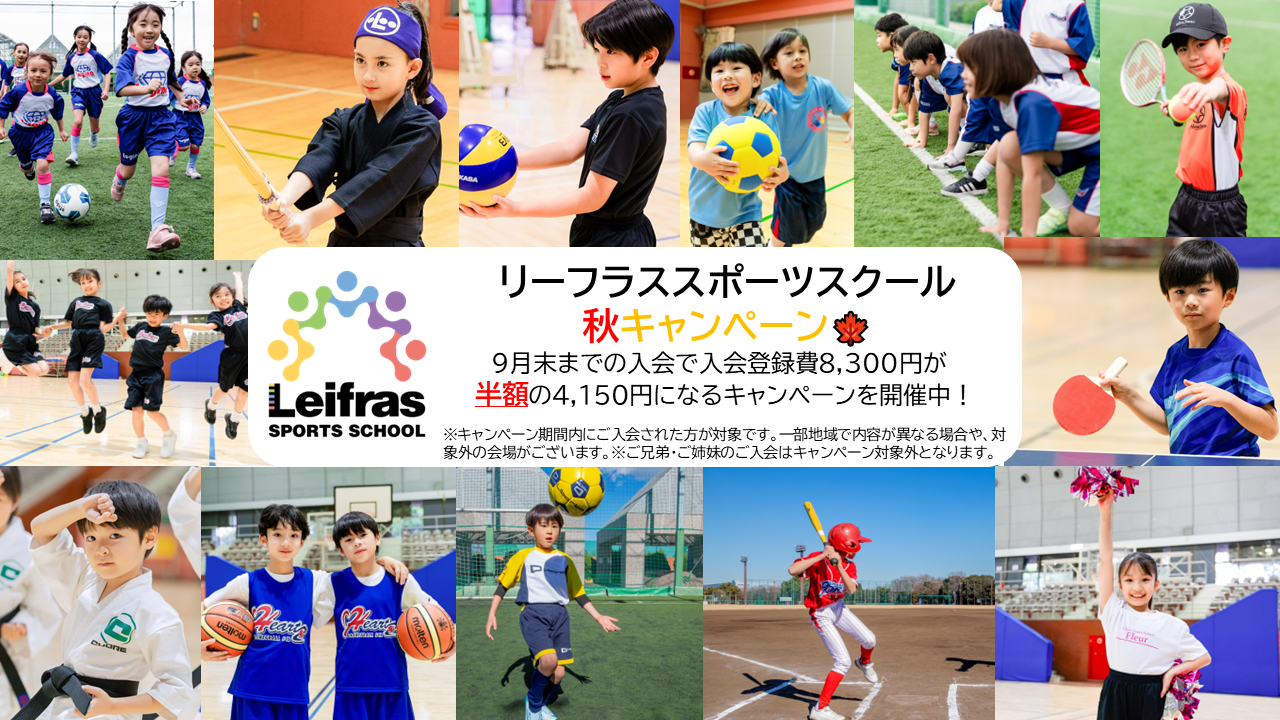 子ども向けスポーツスクールの運営や部活動地域展開支援などを行うリーフラス株式会社(本社:東京都渋谷区、代表取締役:伊藤 清隆、以下 リーフラス)は、当社が運営するリーフラススポーツスクールで入会登録費が半額となる「秋の入会キャンペーン」を全国で実施しております。