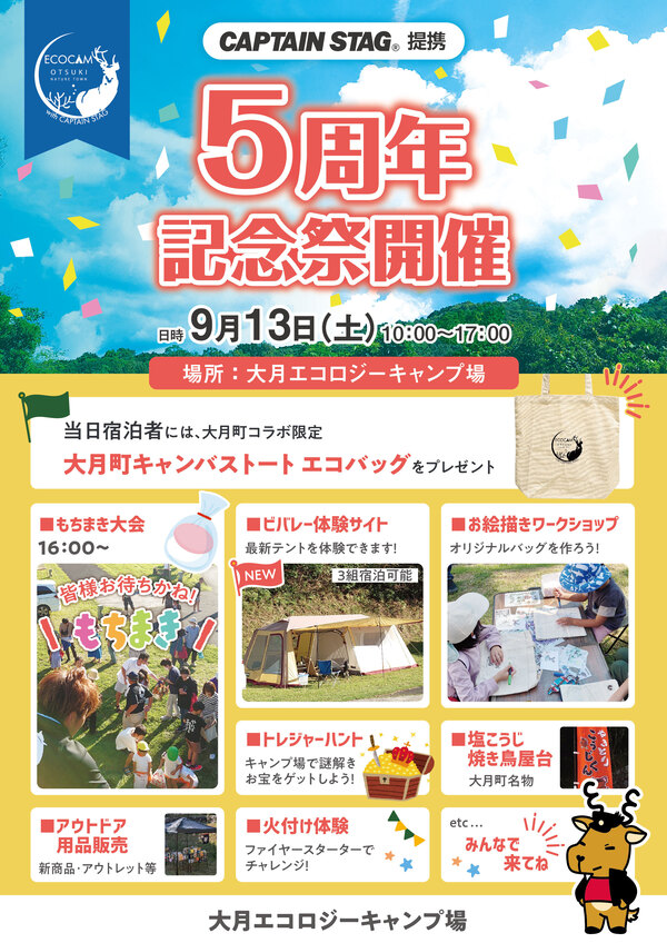 大月エコロジーキャンプ場(運営:株式会社FoundingBase(本社:東京都世田谷区、代表取締役:山本賢司、以下「FoundingBase」)は来たる9月13日(土)、高知県大月町とアウトドアブランド「CAPTAIN STAG(以下、キャプテンスタッグ)」の提携5周年を記念して、「キャプテンスタッグ提携5周年記念祭」を開催します。