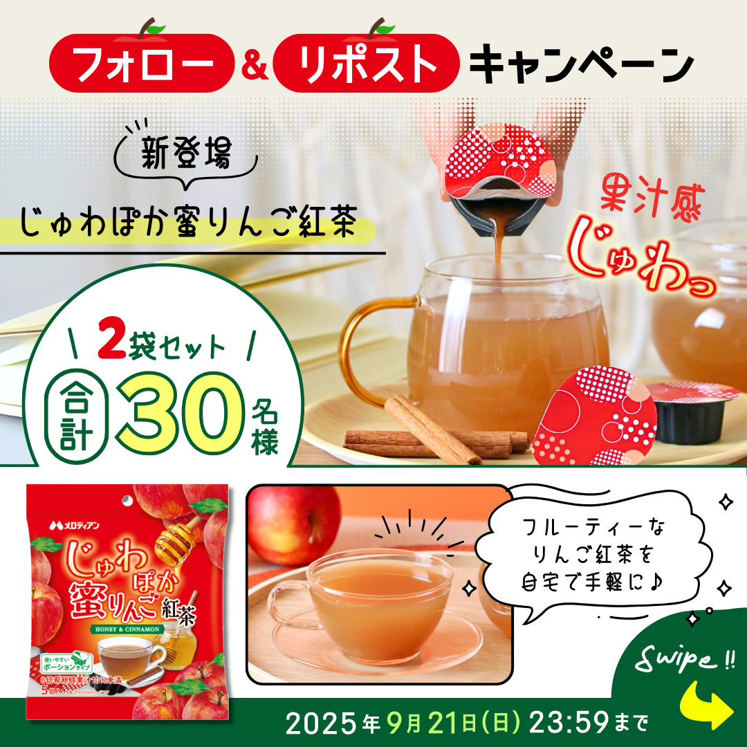 新発売を記念して、「じゅわぽか蜜りんご紅茶」2袋セットを抽選で合計30名様にプレゼント!