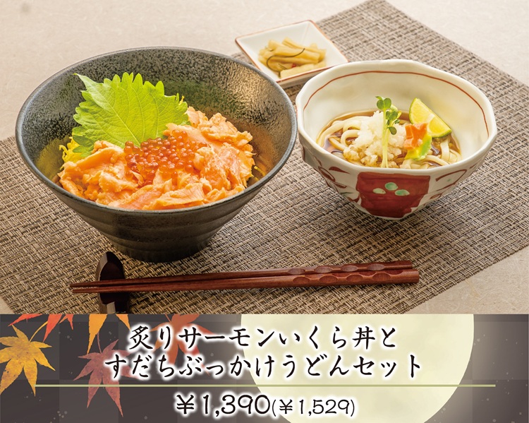 ●炙りサーモンいくら丼とすだちぶっかけうどんセット 1,390円(税込み1,529円)