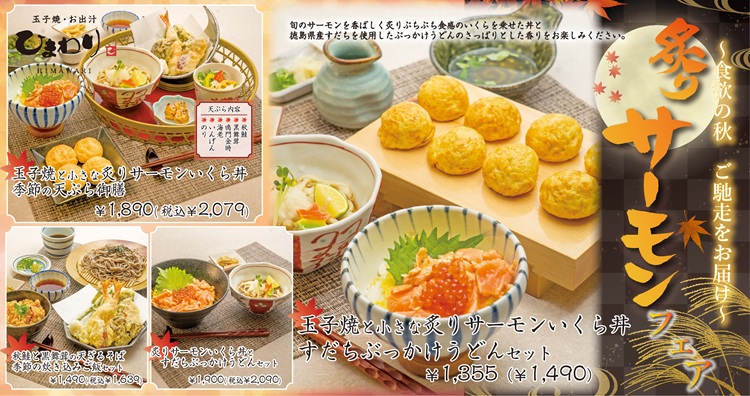 名物玉子焼と炙りサーモンいくら丼、爽やかな香りを味わうすだちぶっかけうどん、旬の食材を使用した天ぷら盛り合わせ等、この秋の美味しい旬を全て味わえる御膳にしました!ぜひ一度ご賞味くださいませ。