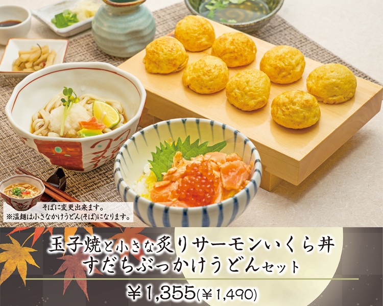 名物玉子焼と香ばしく炙ったサーモンとプチプチ食感のいくらを乗せた「炙りサーモンいくら丼」、すだちの爽やかな香りが楽しめるぶっかけうどんがセットになったメニューです。
