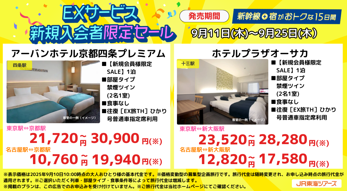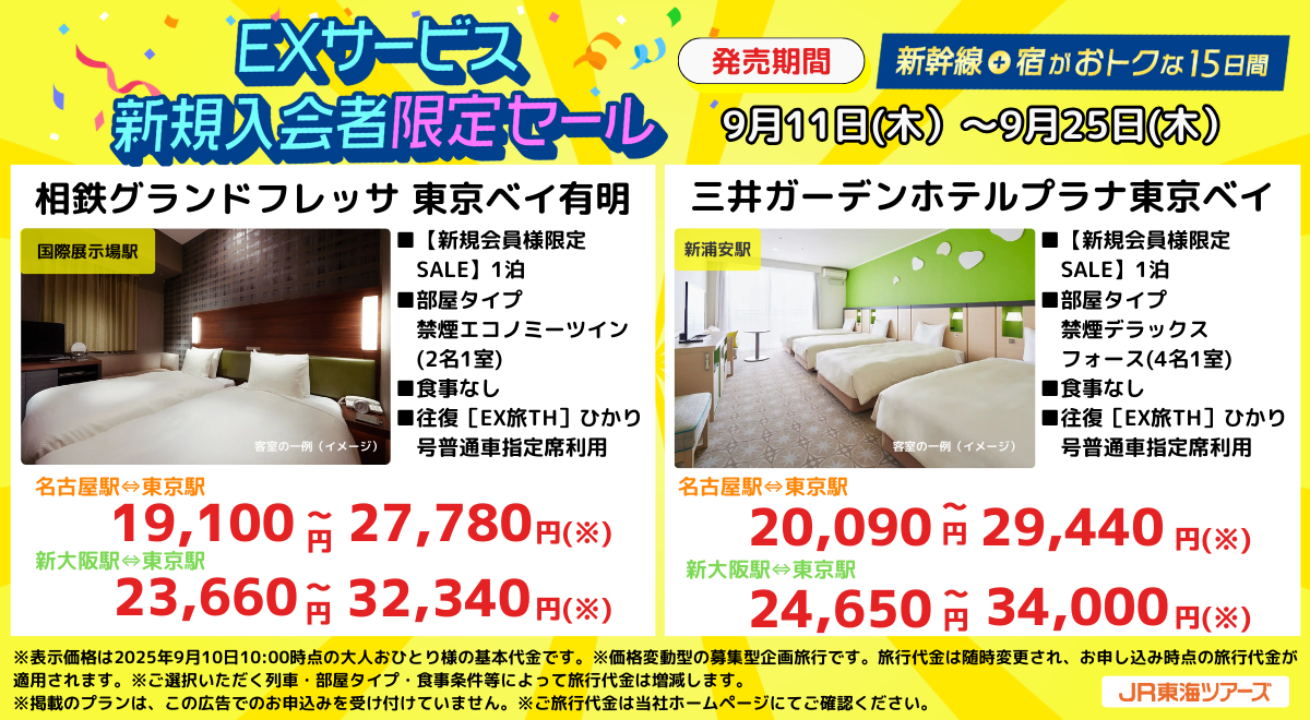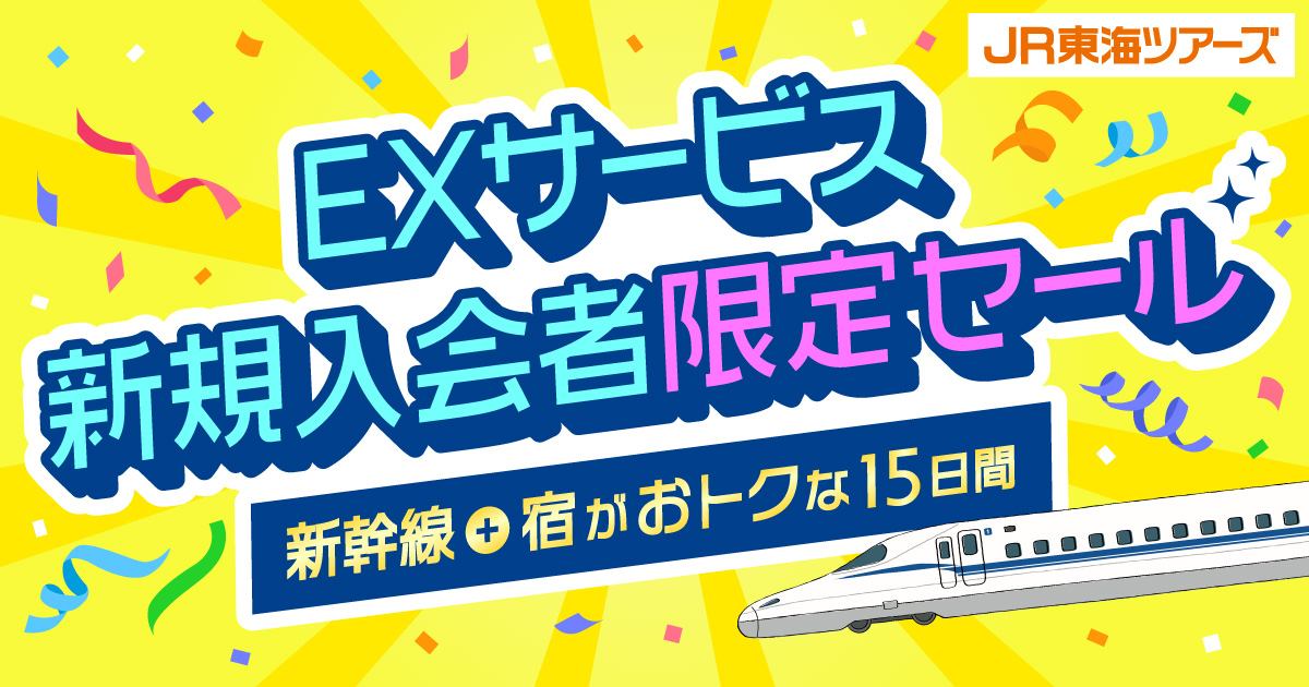 株式会社ジェイアール東海ツアーズ(本社:東京都中央区、以下JR東海ツアーズ)は、EXサービス(「エクスプレス予約」及び「スマートEX」)に新規会員登録※とLINEアカウントを連携いただいた方を対象に2025年9月25日(木)21時まで、「EXサービス新規入会者限定セール」を開催いたします。この機会にご入会いただいた方は、新幹線と宿泊セットのセール商品を特別価格でご予約いただけます。また、EXサービス会員情報にお客様のLINEアカウントをご登録いただくと、初回登録限定で1,000円割引クーポンを配信します! 限定セールへのご招待と1,000円割引クーポンの配信は、ご連携いただいた翌日となりますのでお早めにお手続きください。 新幹線の時間変更が無料で何度でも可能、また1か月以上先の旅行でも予約と同時に利用新幹線が確定するのはEX旅パックだけ!10月から12月の新幹線旅行には「EXサービス新規入会者限定セール」をお見逃しなく! ※既に「エクスプレス予約会員」「スマートEX会員」にご登録をいただいているお客様、及び「スマートEX海外向けサービス会員」「一部の法人モデル会員」のお客様は対象外となります。