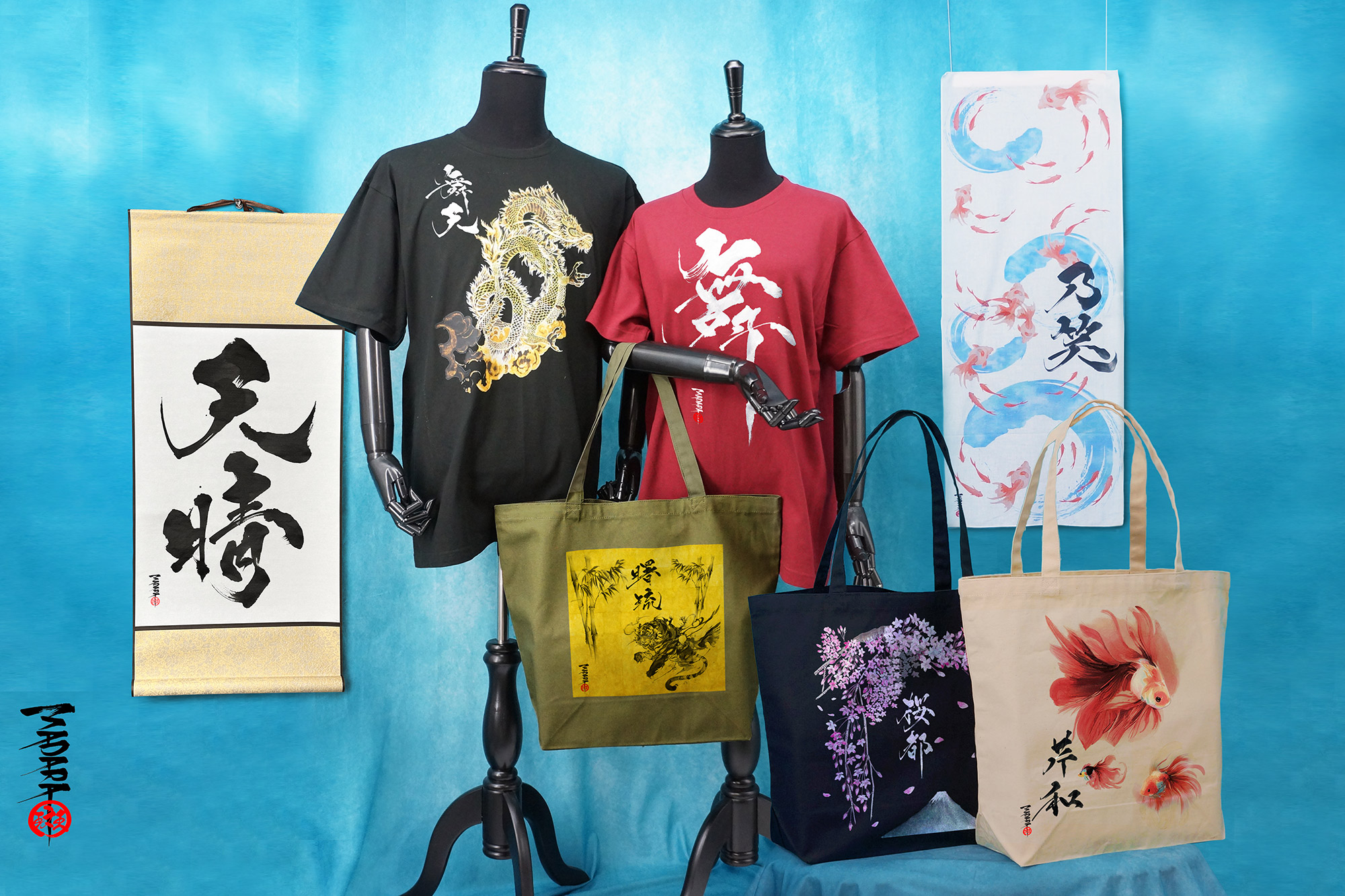 日本の伝統的な書道と墨彩画、さらに「筆跡術」を融合させた独自のブランドです。お客様のお名前を美しい日本の漢字に変換し、それをオリジナルのTシャツやグッズに手作業でプリントして、芸術作品のように仕上げます。