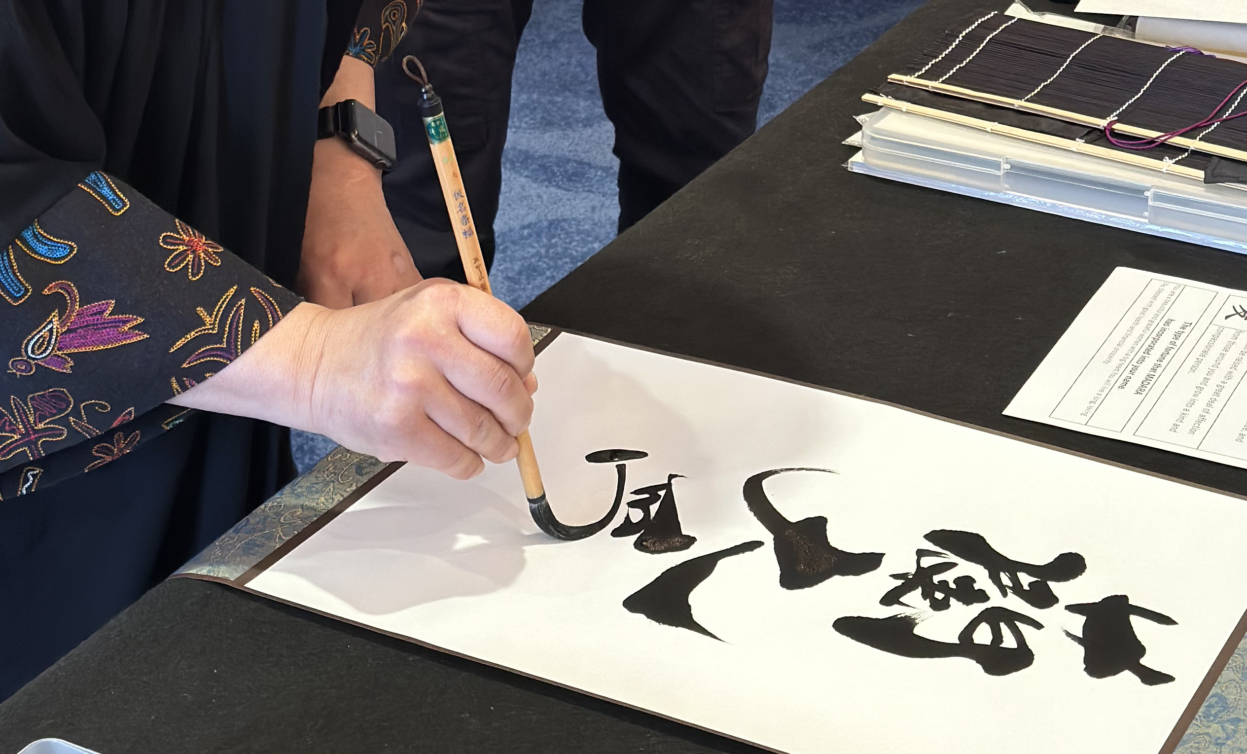 第一部では、斑が参加者に日本書道の基本をやさしく指導し、初心者でも安心して取り組めるようにします。