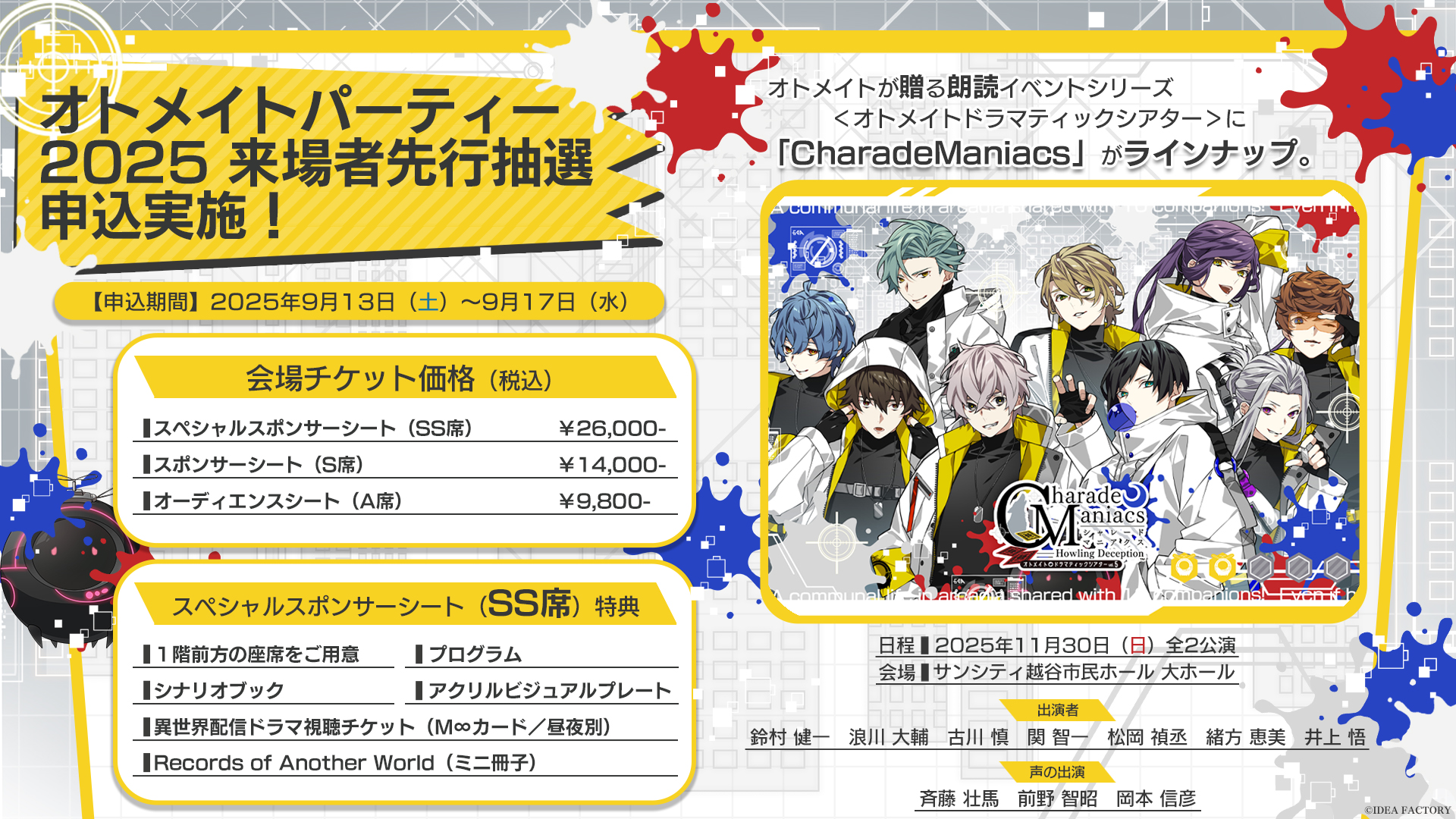また、「オトメイトパーティー2025」会場にて、オトメイトドラマティックシアターvol.05「CharadeManiacs-Howling Deception-」の先行抽選申込みチラシを配布することも、併せてお知らせいたします。
