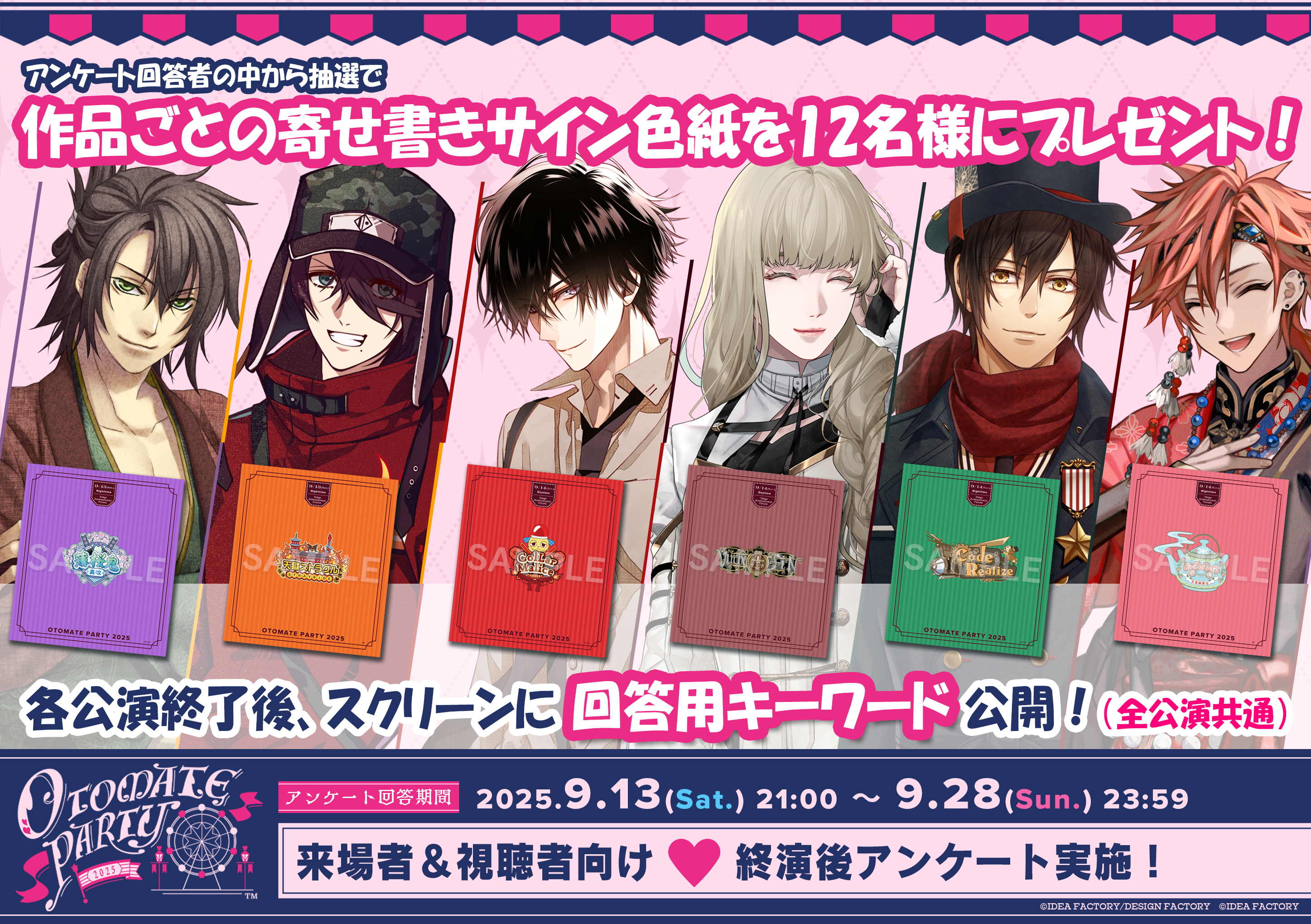 アイディアファクトリー株式会社(代表取締役社長:佐藤 嘉晃/所在地:東京都豊島区)の女性向けゲームブランド「オトメイト」は、今週末13日(土)・14日(日)に東京国際フォームラム ホールAにて開催となる「オトメイトパーティー2025」にて、豪華プレゼントが抽選で当たる終演後アンケートの実施を発表いたしました。