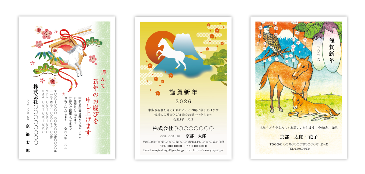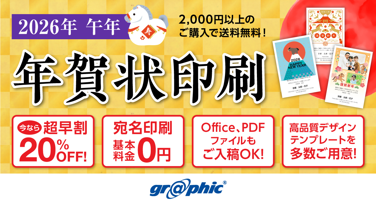 株式会社グラフィック(本社:京都市伏見区、代表取締役社長:西野能央、以下「当社」)はネット印刷通販事業にて、「年賀状印刷(2026年午年)」の注文受付を開始しました。最大20%OFFで年賀状を印刷できる、割引キャンペーンを実施中です。また、300点以上の無料デザインテンプレートをご利用いただけます。