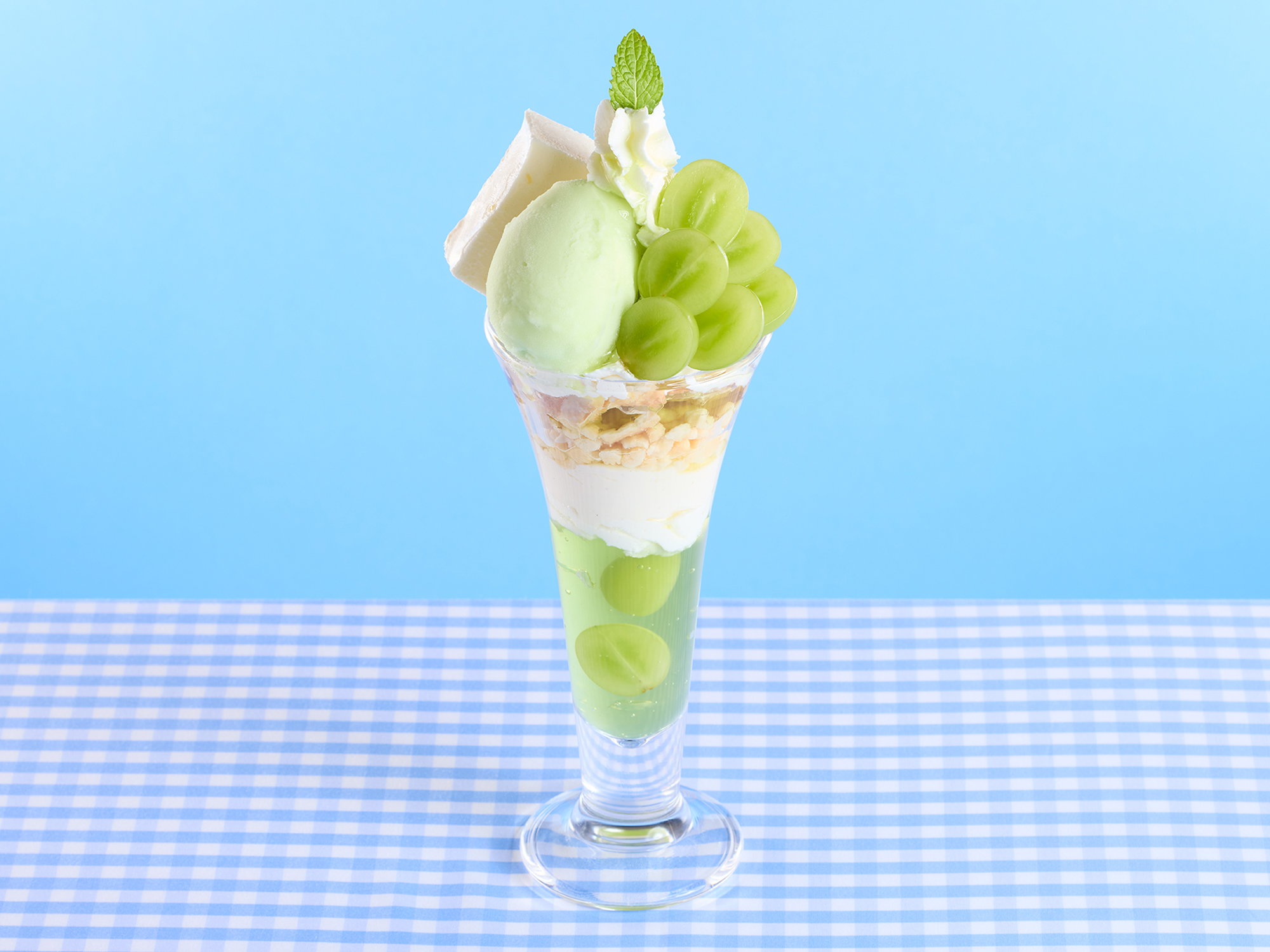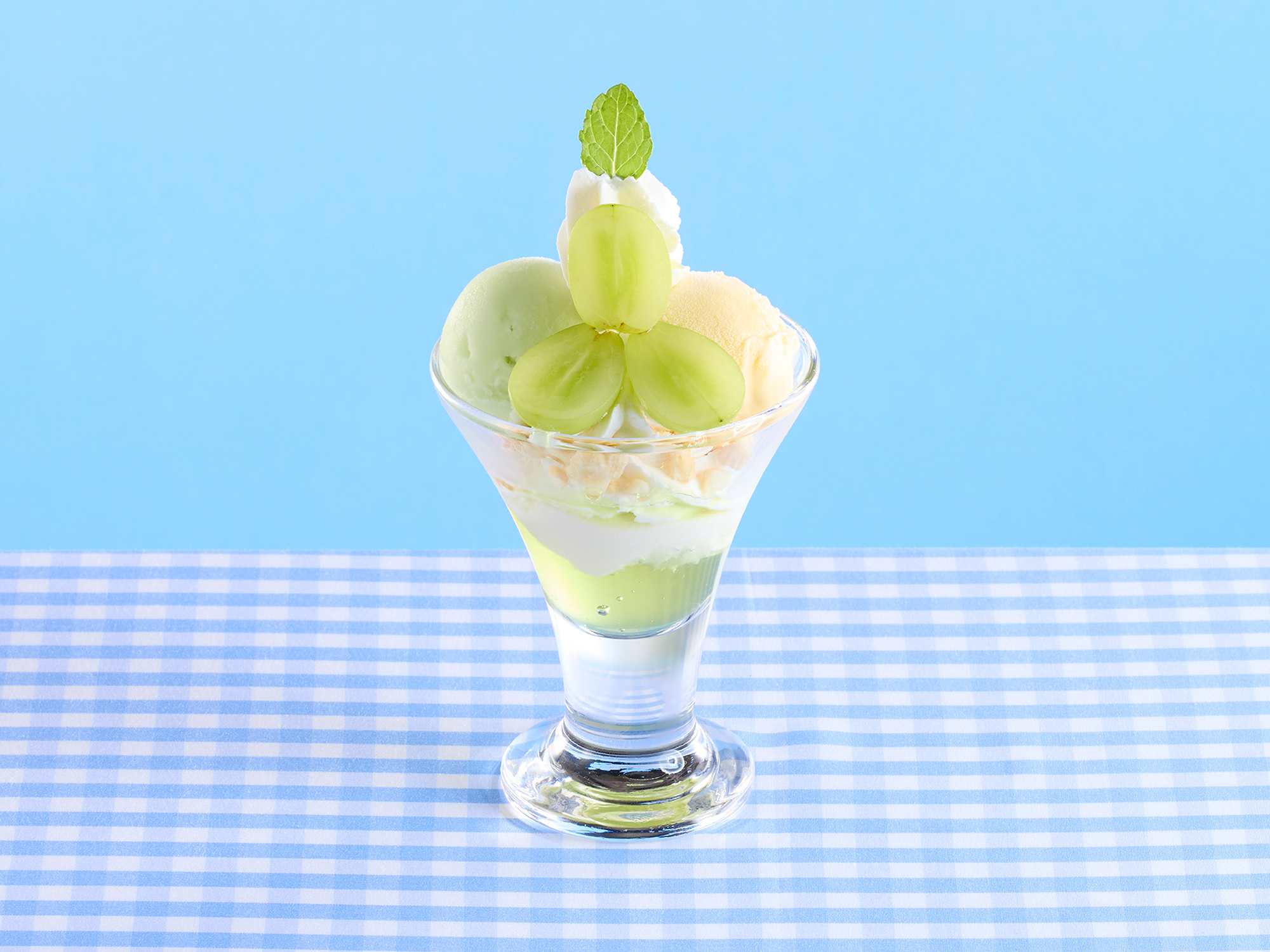 上品な甘さのシャインマスカットや、爽やかな甘さのマスカットジェラート、レモンピールが香るカッサータを贅沢にトッピングしたビッグパフェです。ホワイトチョコを使用したカッサータは、レモンの爽やかな香りとまろやかな味わいが特長。中層のバニラアイスやパンナコッタが、優しい甘さとクリーミーな味わいをプラスします。
