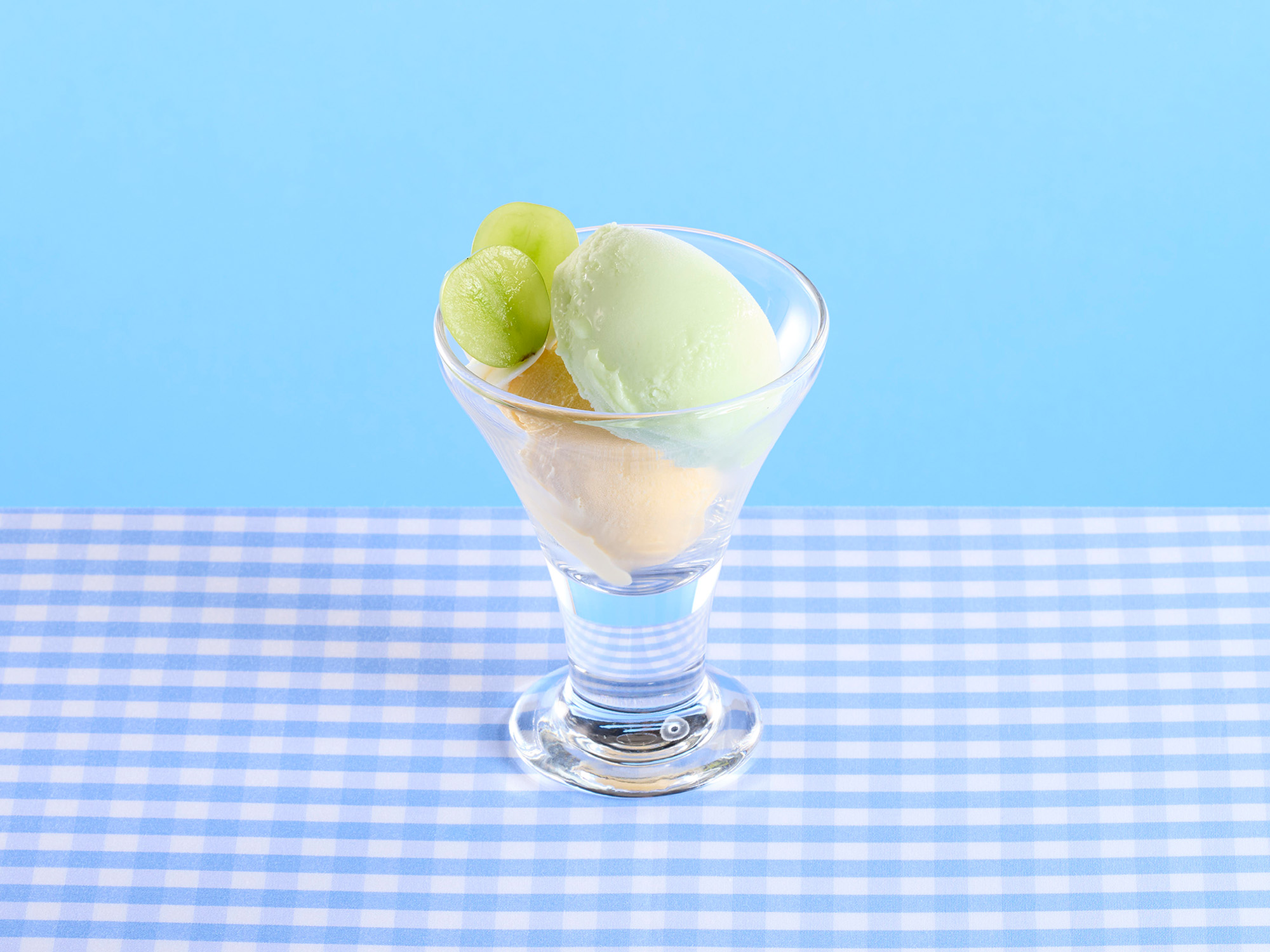 爽やかな味わいのマスカットジェラートと優しい甘さのバニラアイスにシャインマスカットを添えた、食後にぴったりなサイズの一品です。