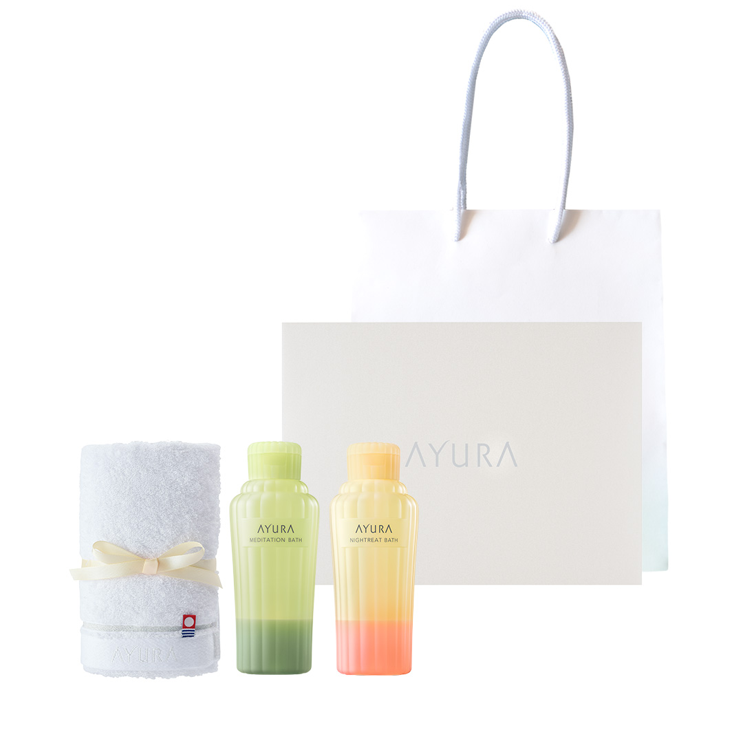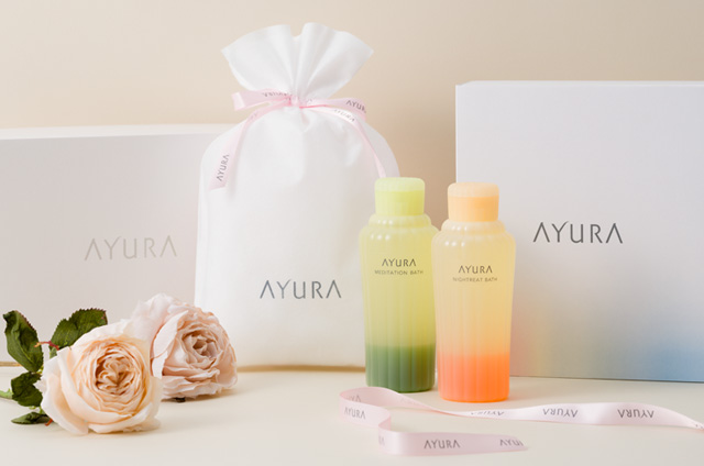 アユーラは1995年の誕生以来、「肌・からだ・心」のバランスに着目し、ストレス社会で生きる人々に寄り添うアイテムをお届けしてまいりました。なかでも「メディテーションバスt」をはじめとする入浴料は、バスタイムを通じて心地よさと癒しを届けるアイテムとして、ご自身用としてはもちろん、大切な方への贈り物としても、多くの方にお選びいただいております。