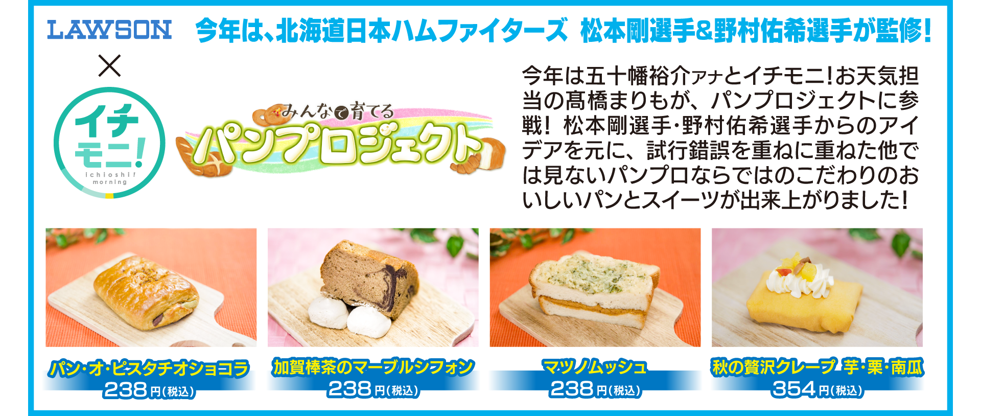 毎年大人気のイチモニ!「みんなで育てるパンプロジェクト」で開発したオリジナルパンの販売も。今年は北海道日本ハムファイターズの松本剛選手・野村佑希選手とローソンとタッグを組み、パンとスイーツを計4種類開発しました!