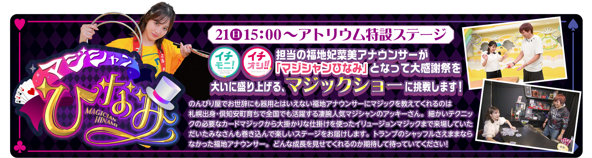 さらに福地妃菜美アナウンサーが「マジシャンひなみ」となってマジックショーに挑戦!