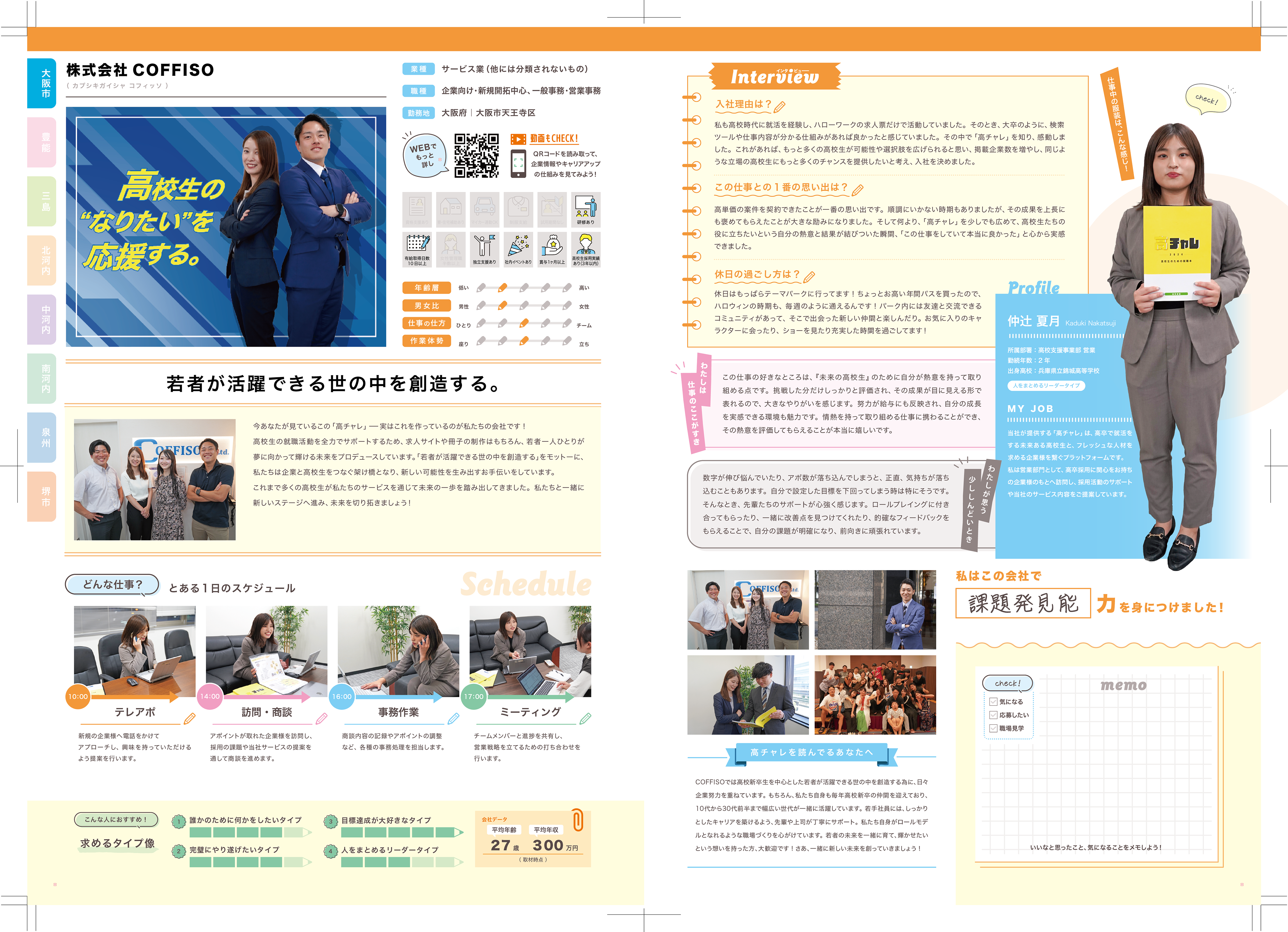 株式会社COFFISO(本社:大阪府大阪市、代表取締役:白﨑 誠志朗 以下「COFFISO(コフィッソ)」)は、高校生のキャリア教育と就職活動を支援する『高チャレ冊子』を近畿地方の高等学校で展開しています。2025年9月1日時点で685校に29,623冊を配布し、多くの授業で教材として活用されました。就職に関する基礎や求人票では伝わりにくい企業の魅力を、ポップで分かりやすい冊子にまとめ、教員や生徒から高い評価を得ています。