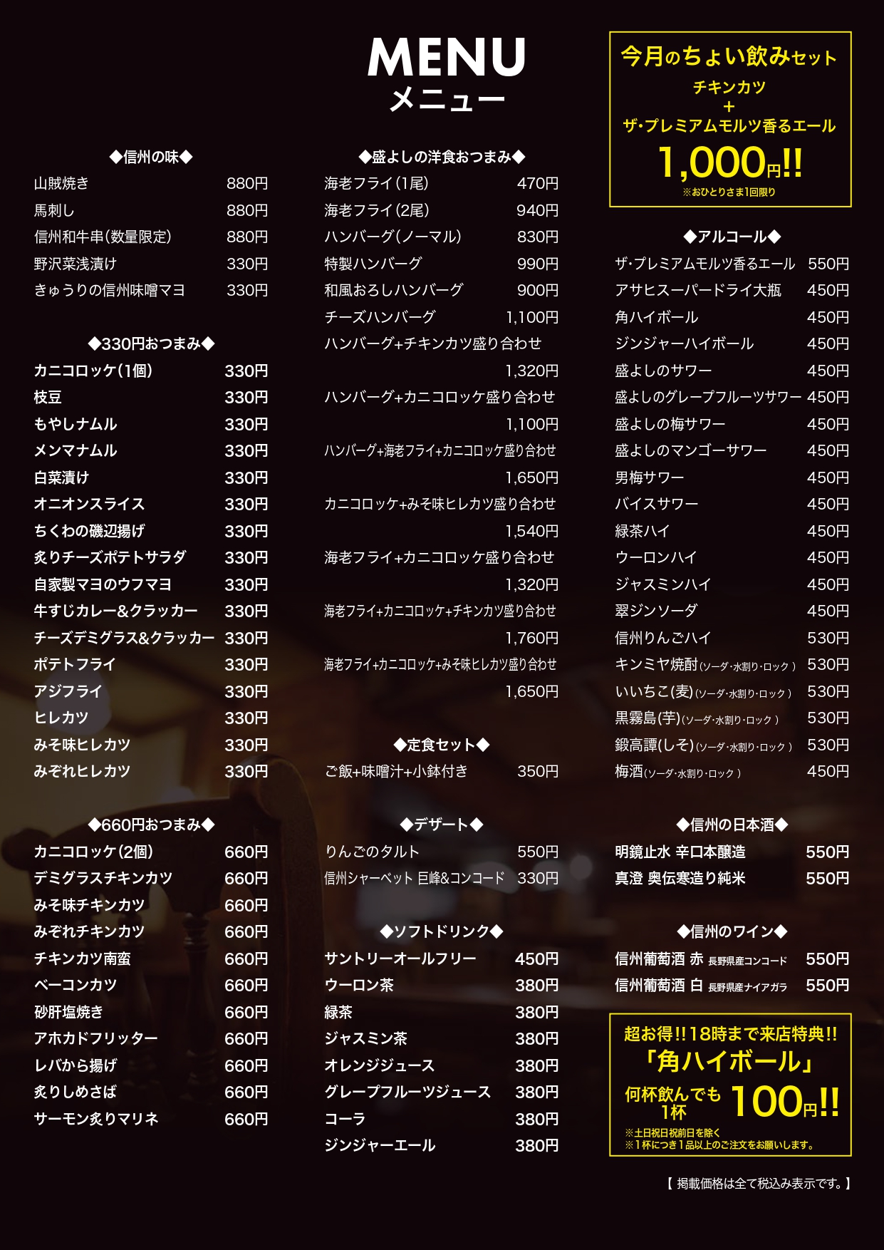 夜の部 (ちょい飲み 盛よし) 17:00〜22:00(L.O.21:30)