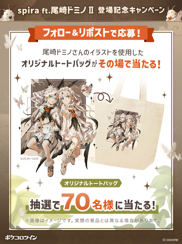 尾崎ドミノさん描き下ろしのキービジュアルを使用した「オリジナルトートバッグ」を、『ポケコロツイン』公式のXアカウントをフォロー&指定ポストをリポストし、キャンペーンサイトでご自身のXアカウントを連携された方の中から抽選で70名様にプレゼントします。