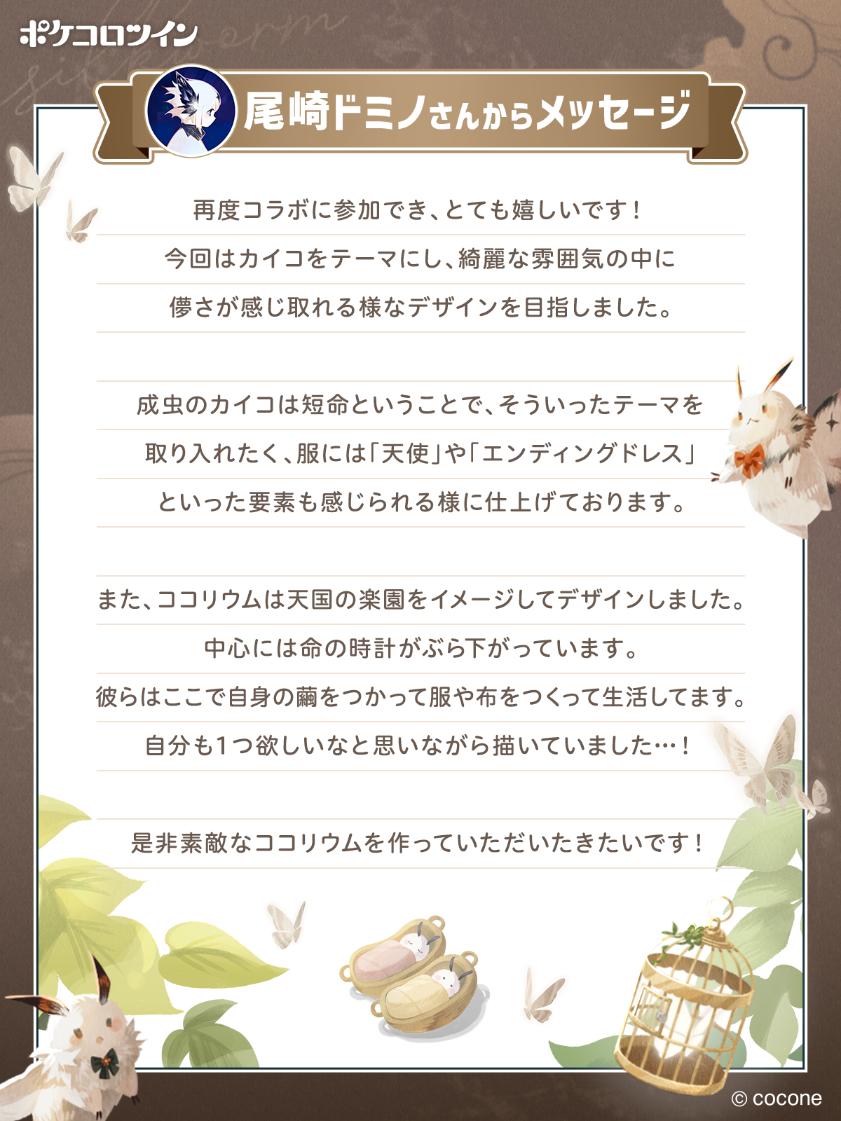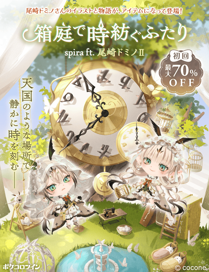 ココネ株式会社(以下「ココネ」)は、ふたごのアバター「ココロン」の着せかえやお客様同士のコミュニケーションを楽しむスマートフォン向けアプリ『ポケコロツイン』において、様々なデザイン様式を融合させ、動物をモチーフにした幻想的なイラストで人気のイラストレーター 「尾崎ドミノ」さんが描き下ろしたイラストをアイテム化し、これらを記念した特別イベントを本日より開催することをお知らせします。