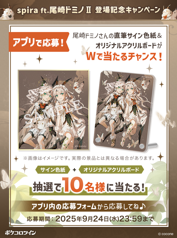尾崎ドミノさん直筆サイン色紙と描き下ろしのキービジュアルを使用したオリジナルアクリルボードを、抽選で10名様にプレゼントします。『ポケコロツイン』のアプリ内から応募できますので、この機会にぜひ遊んでみてください。