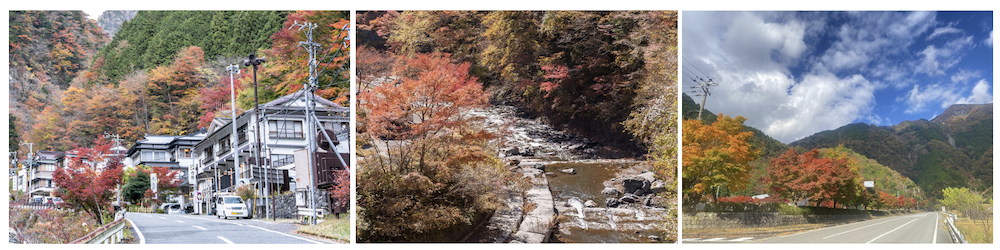 武田氏の武将が治療に使用していた隠し湯を引湯したと伝わる温泉地です。梅ケ島コンヤの里レクリエーション施設のテニスコート周辺の街道が真っ赤に彩られ、青空とのコントラストが鮮やかです。