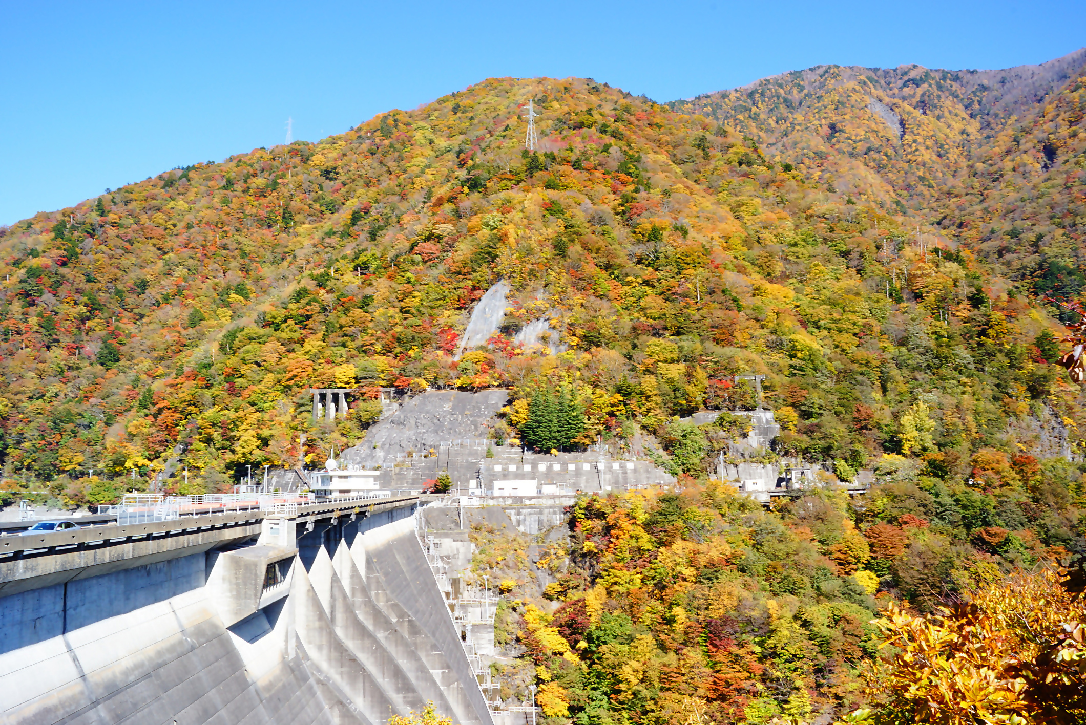 ダム湖の水面と紅葉のコントラストが鮮やかです。渡船も運航していて、湖上から見る紅葉も格別です。