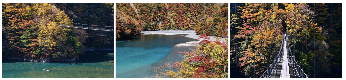 長さ181メートルのスリル満点な吊り橋。南アルプスの茶臼岳へ向かう登山ルートのスタート地点で、県内有数の紅葉スポットにもなっています。