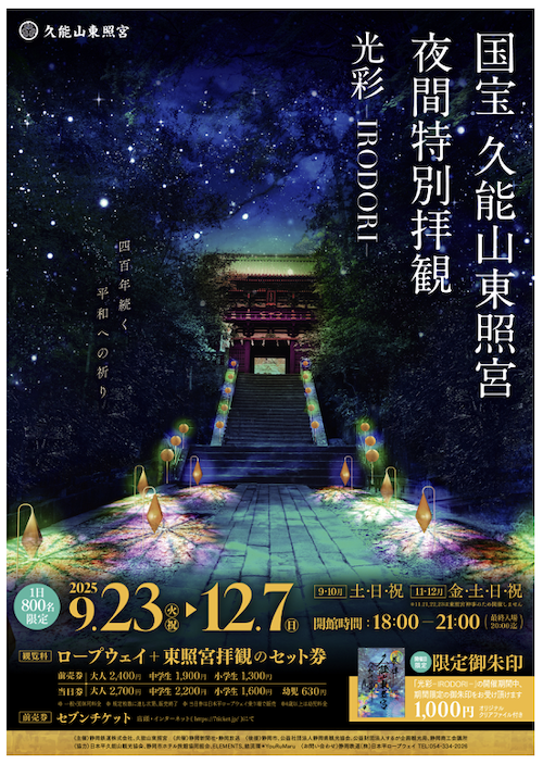 久能山東照宮では、毎秋恒例の夜間特別拝観イベントがリニューアルされ、「国宝 久能山東照宮 夜間特別拝観 光彩-IRODORI-」が開催されます。