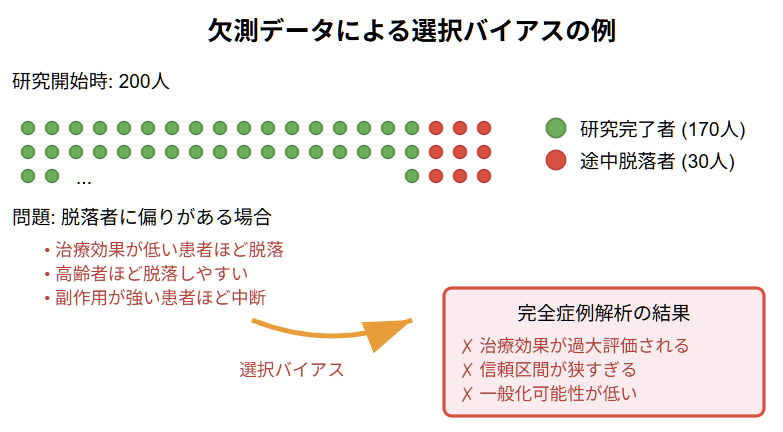 特に重要なのは、欠測データが完全にランダムでない場合(MAR: Missing At Random、MNAR: Missing Not At Random)、完全症例解析では選択バイアスが生じ、治療効果の過大評価や過小評価につながる可能性があることです。年齢の高い患者ほど研究を途中で離脱する場合、残ったデータだけで解析すると、真の治療効果を見誤ってしまうのです。