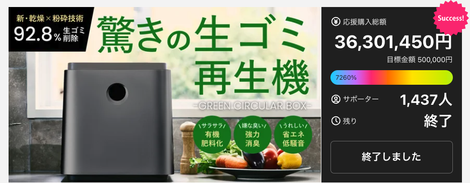 - Makuake「生ゴミ処理機」カテゴリー史上最多サポーター数約1,437人を記録※