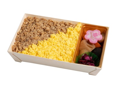 だし炊き込みご飯の上に九州産の華味鳥を使用した鶏そぼろと、炒り玉子を敷き詰めたボリュームのあるお弁当です。