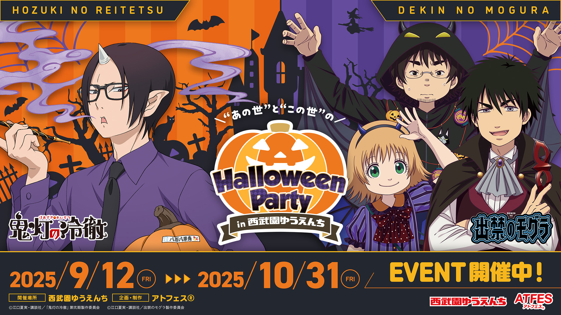 株式会社クリーク・アンド・リバー社は、人気ゲーム・アニメとレジャー施設とのコラボレーションイベント「アトフェス®」の新企画として、本日9月12日(金)から10月31日(金)までの期間、TVアニメ『出禁のモグラ』・TVアニメ『鬼灯の冷徹』とのコラボイベント「"あの世"と"この世"のハロウィンパーティ」を西武園ゆうえんちで開催いたします。