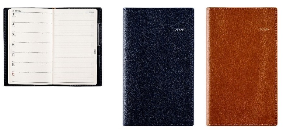 ビジネス手帳に新シリーズが登場。老若男女問わず使いやすいカラーリングと、さりげない高級感を演出するステッチ入りのカバー。コンパクトなサイズながら、紙面を大きく使えるレイアウトになっています。週間レフト式のみ。カバーの色はネイビーとキャメルの2色のラインナップ。