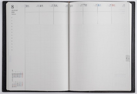 週間バーティカル式とノートのいいところ取りの新しい記入形式「週間バーティカルノート式」が、『フェルテ®』と『デスクダイアリー カジュアル』シリーズに仲間入り。「予定も書きたい、ノートのようにも使いたい!」という方におすすめの記入形式です。メモスペースは方眼になっており、図やイラストを描くのはもちろん、文字を書くのにもさりげなくガイドになるので書きやすくなっています。