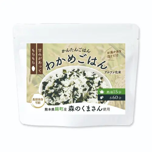 熊本県錦町産「森のくまさん」の甘みと、香り豊かなわかめを合わせたアルファ化米。わかめには、災害時に不足しがちな食物繊維が含まれており、栄養面でのサポートも期待できます。ほんのり磯の香りが食欲を引き立て、お子さまから大人まで食べやすい味わい。非常食としてはもちろん、普段の軽食やアウトドアでも便利にお使いいただけます。