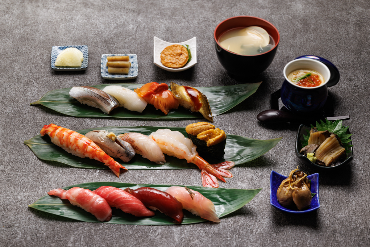 最高峰の食材を使用した全17品のコース仕立て。東京湾(江戶湾)でとれた天然の魚、豊洲から直送された新鮮な食材を使用し、江戶時代から続く職人の技「湯霜」「漬ける」「炙る」「昆布〆」「煮る」「酢〆‧塩〆」でさらにネタのおいしさを最大限に引き出し、皆様の目の前で丁寧に握ります。