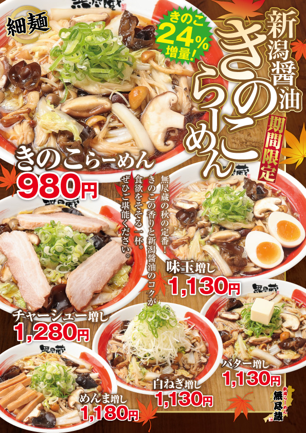 「新潟らーめん 無尽蔵」は、2025年9月で24周年を迎えます。日頃のご愛顧に感謝をこめて、きのこの量を昨年から24%増量します。様々な値上げが続く昨今ですが、お値段は昨年と変わらず据置きとしました。