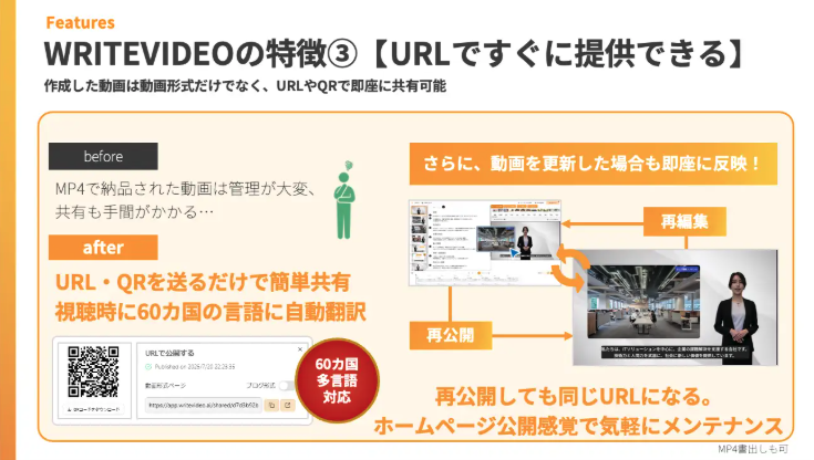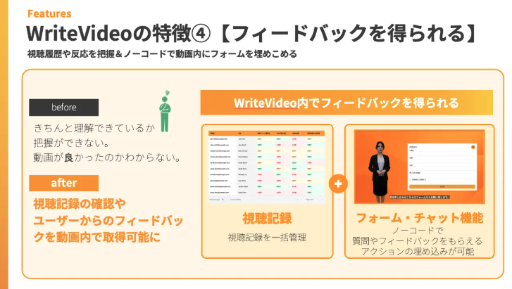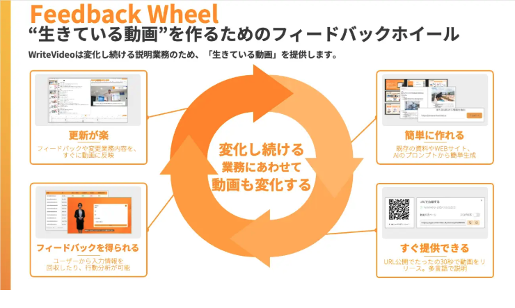 「簡単に作れる」「すぐに提供できる」「フィードバックを得られる」「更新が楽」という4つの機能を持つ説明業務の代替に特化したAI動画生成サービス。