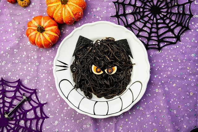 イカ墨で黒猫に仮装したチェシャ猫は、「この姿なら、いたずらし放題!」と暗闇に紛れてご満悦。鋭く光る目元に、不敵な笑み。どうやら何かを企んでいるようです。その真相は、このパスタを食べて笑顔になったそのときに分かるかもしれません。