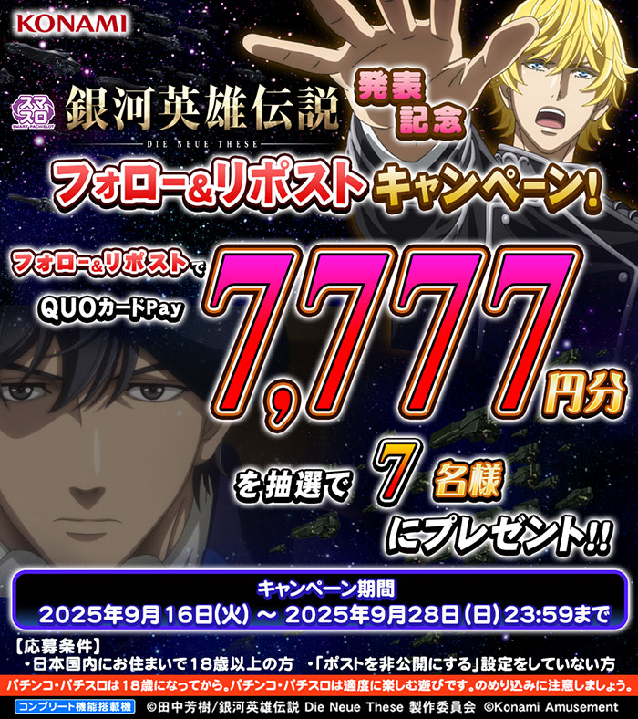 スマスロ新機種『銀河英雄伝説 Die Neue These』の発表を記念して、「コナミアミューズメント パチンコ・パチスロ【公式】」公式X(@573_KA_PP)をフォローし、指定のポストをリポストいただいた方の中から抽選で7名さまに「QUOカードPay」7,777円分が当たる「『銀河英雄伝説 Die Neue These』発売記念フォロー&リポストキャンペーン」を開催します。