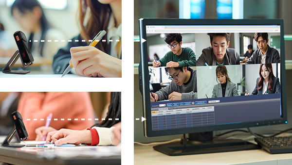 受験席にも1名1台ずつハンディカメラを設置、各カメラには受験番号と受験者の顔情報を登録してあるので受験者は着席後顔を撮影、登録とのチェックを行います。