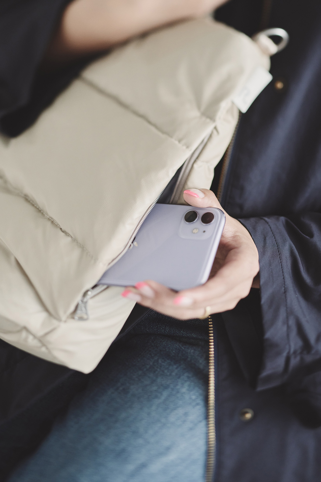 スマホやイヤホンなど、必要最低限のものを持ち歩くための小さなフェザールー。 ルーポケットはリップなどの小物収納に。 ショルダーベルト付き 2WAY仕様。