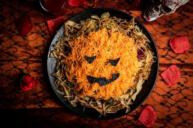 「ハロウィンは己が主役!」と言わんばかりに登場するパンプキンモンスター。けれど血を啜り甦る儀式を終えたら、主張強めのその姿は容赦なく崩して大丈夫。かぼちゃ頭を形作っていたニンジンを始め、旬のさつまいもやごぼうなどの根菜類と、瑞々しい葉物野菜たちが渾然一体となる美味しいサラダが完成します。