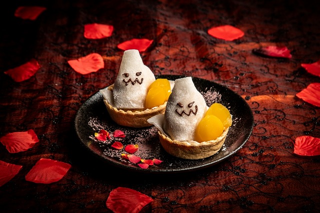 宴のトリに踊り出すのは、このシーンでは毎年お馴染みのシーツゴーストちゃん。でも実はその“ふわもち”のシーツの中に隠している甘~いスイーツは毎年違うのです。今年は栗のタルト。モンブラン風のクリームと、栗の実の上品な甘さが、宴の締めくくりとともに、しみじみと秋の訪れを感じさせてくれます。