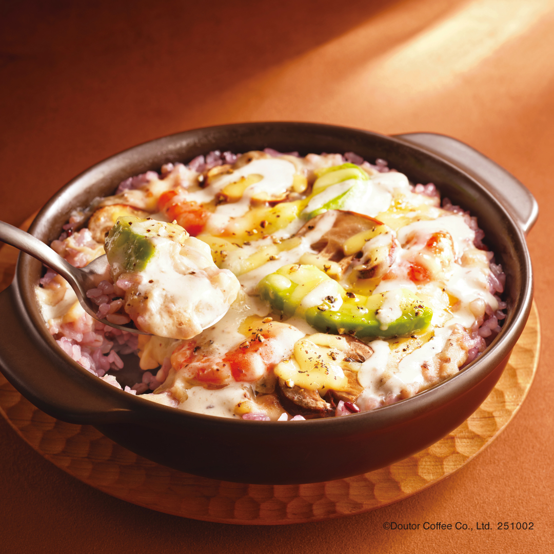黒米やもち麦をブレンドした国産コシヒカリの雑穀ご飯の上に、まろやかな味わいのホワイトソースとトリュフ入りきのこペーストを合わせました。具材にはぷりっとした海老の食感とクリーミーなアボカド、マッシュルームをトッピングし、仕上げにポルチーニソースをかけた味わい深いドリアです。トリュフ×ポルチーニ×マッシュルームの3種のきのこの風味が香り立つ一皿です。
