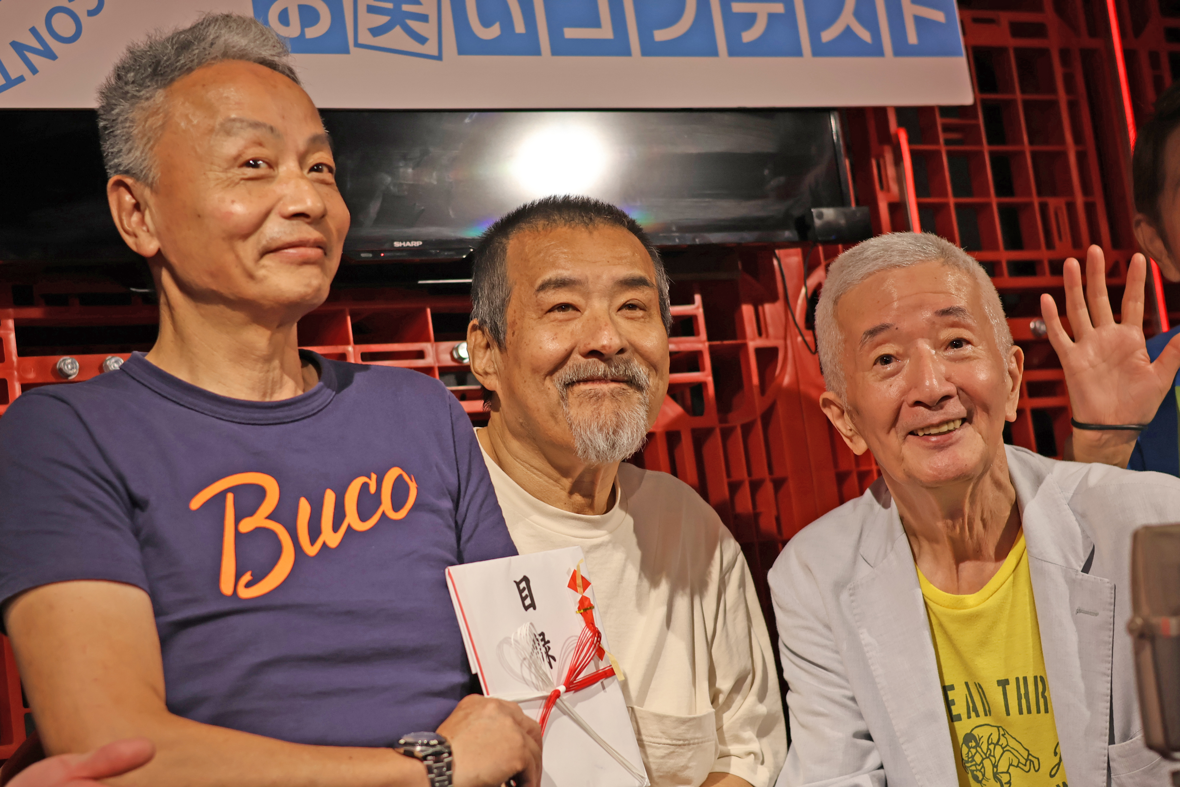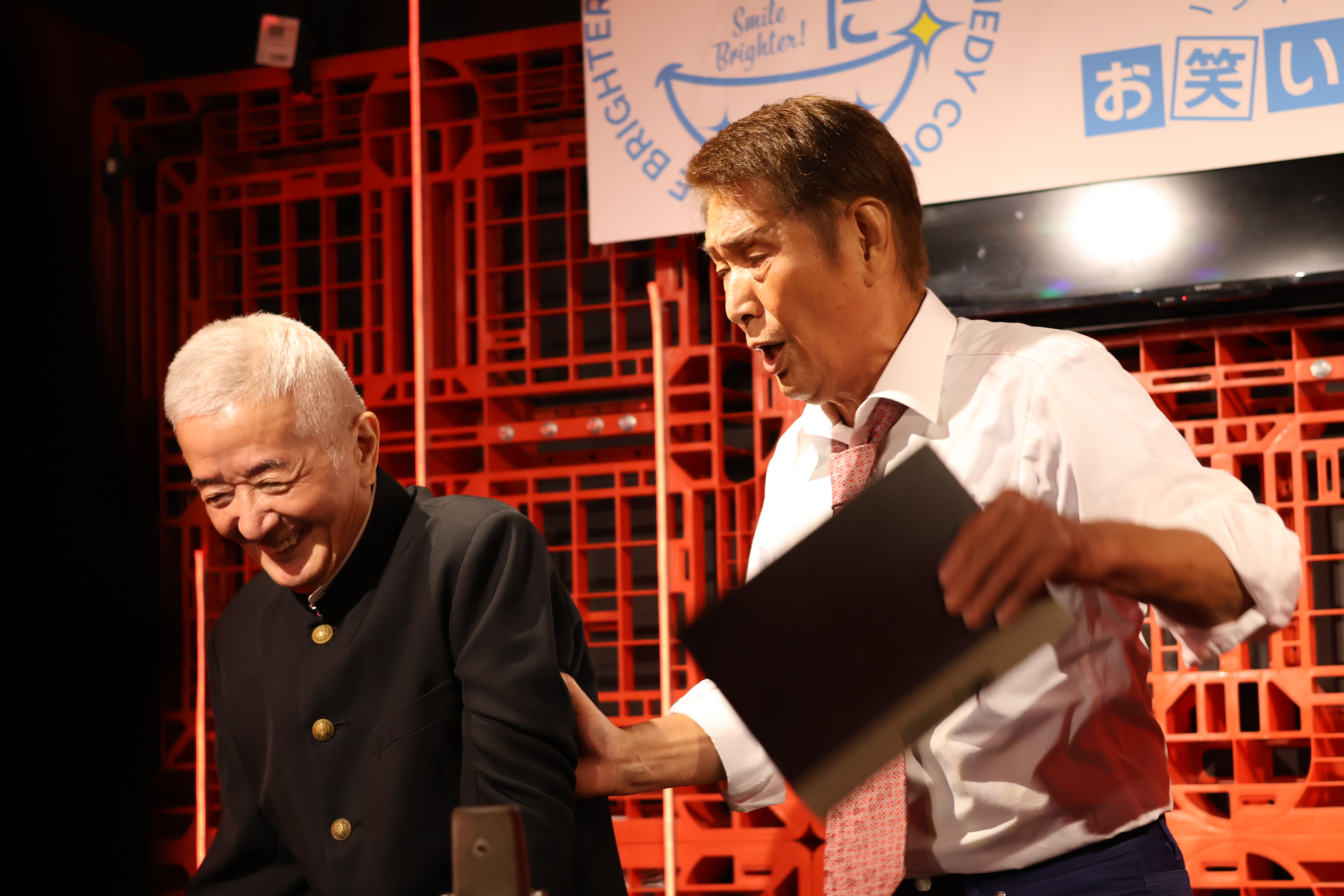 MCを務めたのは初代王者・九州男子さん。第2回優勝を果たした「へのへのもへじ」さんは、審査員のぼんさんこと西田和昭さんと、当日来場していたコント青年団の青木イサムさんが即席で結成したコンビで、いずれもゆーとぴあホープ師匠のお弟子さんです。