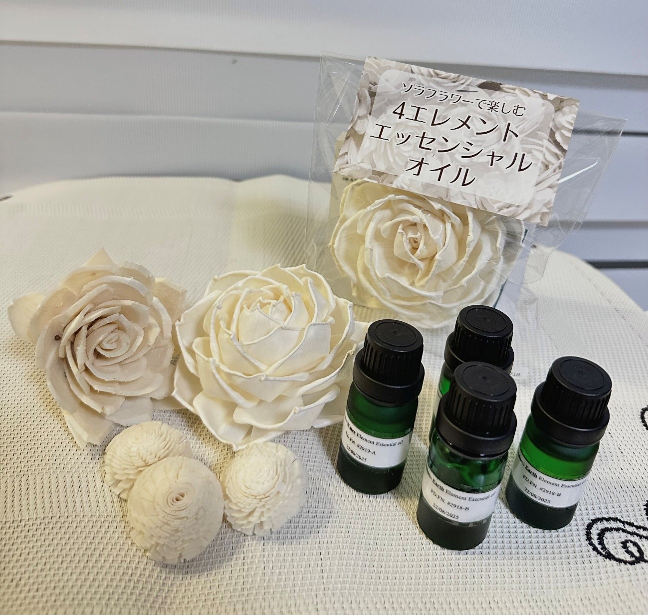 今回は、タイ産のソラフラワーに「4エレメントエッセンシャルオイル」を数滴たらし、アロマフラワーにしたものをお配りいたします。8つの香りの中から、誕生月に沿って香りをお選びいただけますので、この機会にぜひ、ご自身のために選ばれた香りを見つけください。