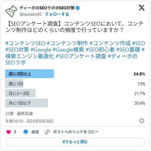 本調査は、ディーボが運営する「SEOラボ」の公式Xアカウント(@seolabo85)にて、2025年8月28日~9月12日の期間、「コンテンツSEO」に関する12項目アンケート調査を実施しました。