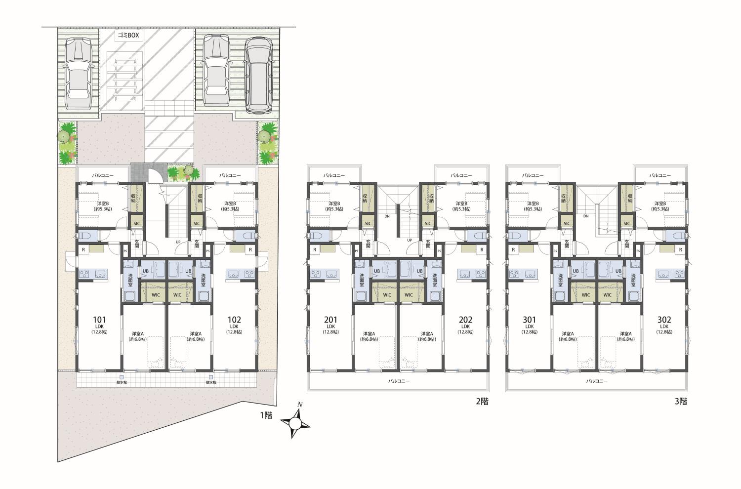 木造3 階建て・全6 戸(すべて2LDK)のファミリー向け木造マンションで、駐車場3 台分と12 台対応の駐輪ラックを備えています。川沿いの遊歩道に面し、通風と採光はとても良く、子育て世帯にも安心感を与える落ち着いた環境が整っています。