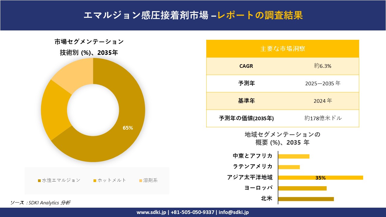 世界のエマルジョン感圧接着剤市場規模、シェア及び傾向分析調査レポート 2025-2035年 – アプリケーション別、タイプ別、エンドユーザー製品別、技術別、地域別のセグメンテーション